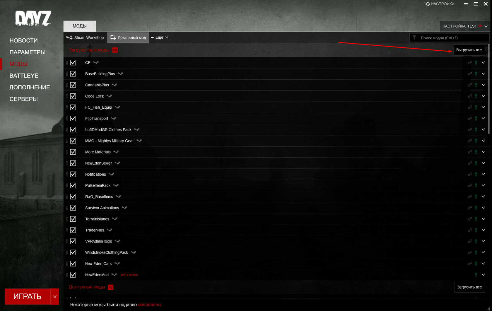 Запустите Dayz и выгрузите лишние моды по кнопке «Выгрузить все»