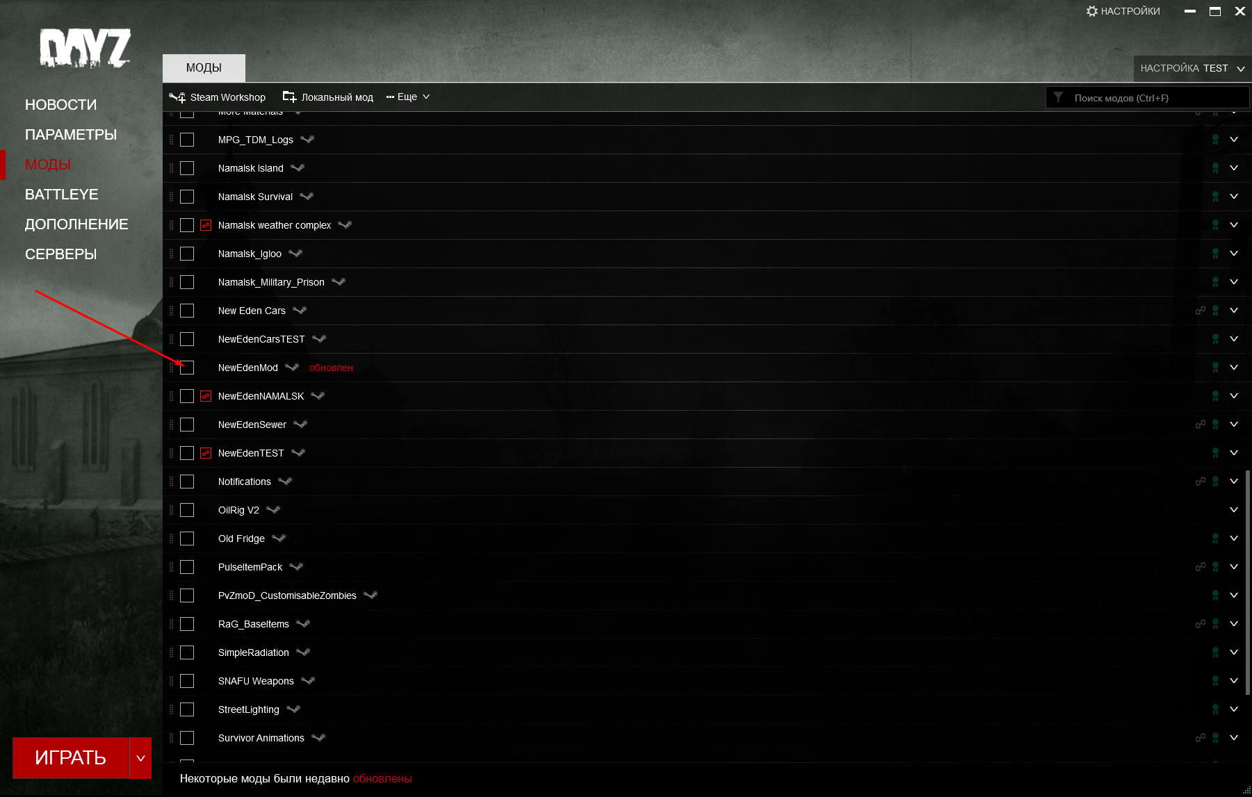 Найдите свежескачанный мод в лаунчере New Eden и нажмите галку напротив него