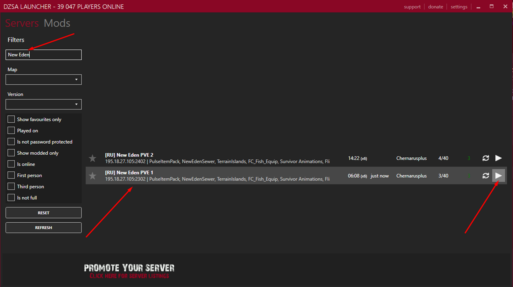 Нажмите кнопку «Играть», далее в меню снова кнопка «Играть» и выберите нужный сервер